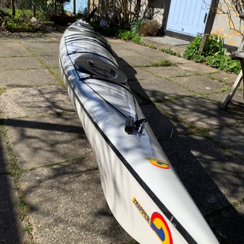 Glasfiberkajak sælges med nyt ror, ny aptering, ny pagaj og nyt spray skirt.