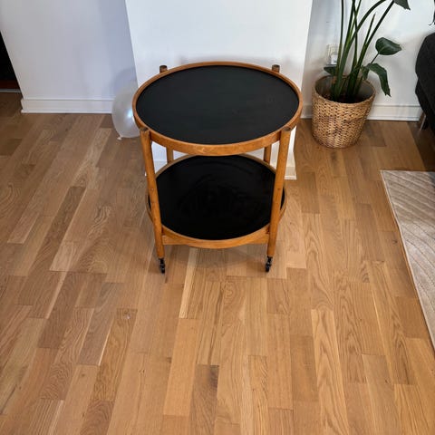Ø 50 bakkebord af Eg/laminat. Bakkerne kan begge tages af og er sorte på den ene side og hvide på den anden. Remmen om bakken er lidt løs og derfor lidt åben i samlingen.