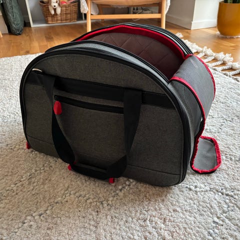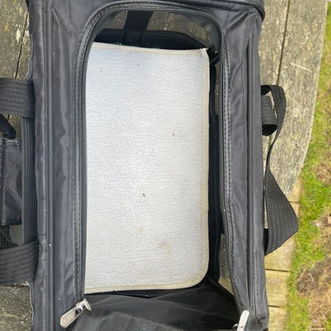 Polyester, med nylonrem og lille karabiner til sikring af dyret, højden i taskens indre kan indstilles individuelt ved hjælp af en lynlås, med indstillelig og polstrede skulderremme, samt maverem, vaskbar ved 30°C, vægt på op til 6,0 kg.