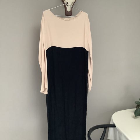 Fantastisk flot kjole med vidde, lange ærmer + bindebånd.