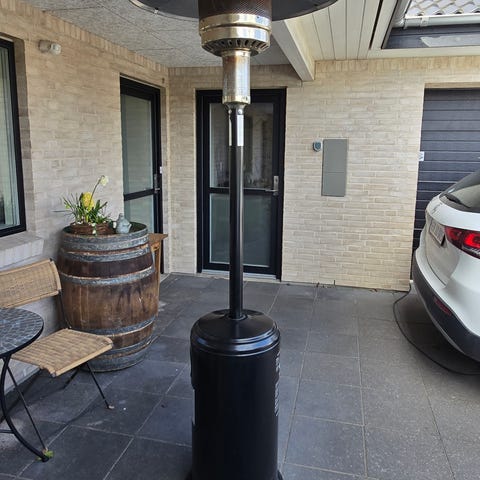 Terrassevarmer i pyramidemodel til gas, udført i sølvfarvet stål med beskyttelsesgitter hele vejen rundt om brænderen. Øverst er der en reflekterende varmeplade, som fordeler varmen ud over terrassen. Nederst er der plads til gasflaske bag en sort frontplade. Medfølgende overtræk/cover til opbevaring og beskyttelse mod vejr. Velegnet til brug på terrasse, altan eller i gårdhave, hvor der ønskes lokal udendørs opvarmning.