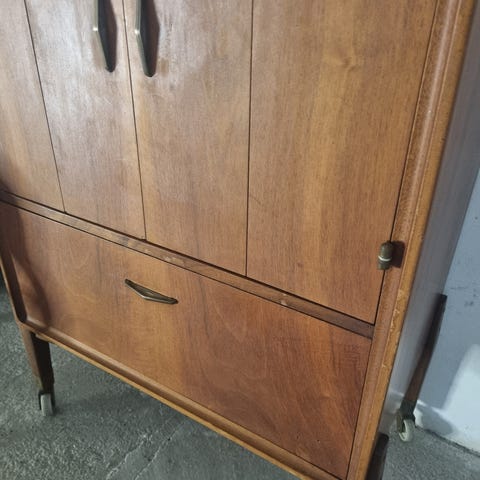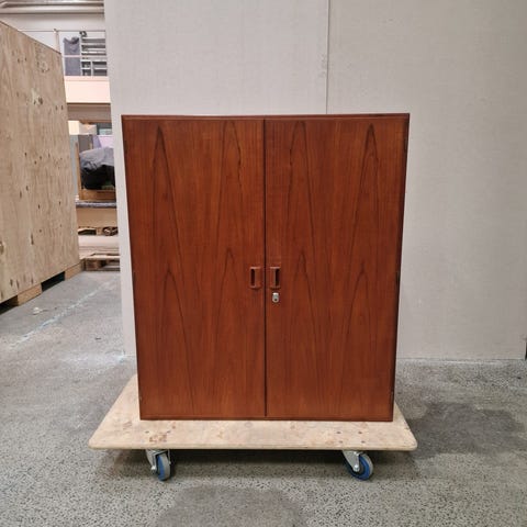 Flot Børge Mogensen skab i teak med messing beslag. Skabet har været brugt som TV møbel og har derfor fået monteret indvendige beslag så det kan monteres på væggen, samt huller til ledninger i top og bund pladen.