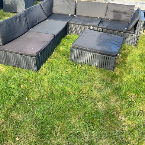 Havesæt bestående af loungesæt med bord og hjørnesofa i sort polyrattan. Sættet omfatter et rektangulært bord med plade i matchende mørk farve samt en hjørnesofa med plads til flere personer. Konstruktionen er i flet-look polyrattan, som er egnet til udendørs brug på terrasse, altan eller i have. Sættet giver mulighed for både afslapning og spisning udendørs. Der er tilhørende hynder og ryg puder pakket væk i skuret ca. 3 år gammelt