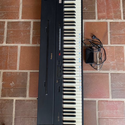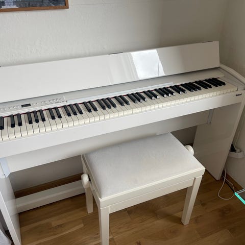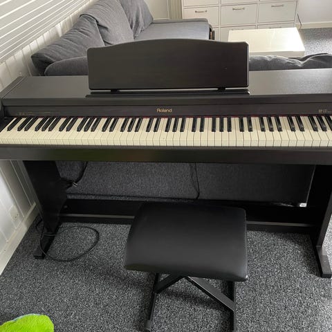 Roland digitalpiano i sort kabinet. Instrumentet har fuldt klaviatur med hvide og sorte tangenter samt indbyggede betjeningsknapper over tangenterne til blandt andet lydvalg, effekter og volumen. Egnet til hjemmebrug, øvning og generel musikudøvelse, hvor der ønskes et kompakt klaver med indbygget stativ og pedaler.
