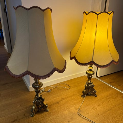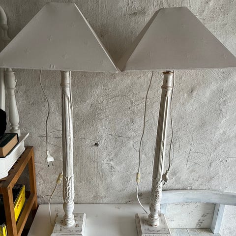 Sælger dem fra et indbo ved ikke så meget om dem. De to store bordlamper er ca. 60 cm høje. Prisen er for det hele 400 kr. Tlf 4074259