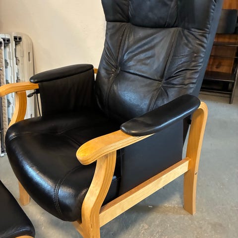 Denne komfortable lænestol er betrukket med sort læder på alle slidflader og sort pvc på alle andre flader.