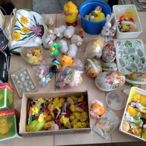 En halv flyttekasse med mange forskellige påske pynt.