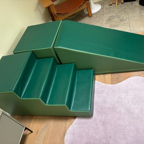 IGLU legeskum sæt til børn i rød og blå. Sættet består af flere store skumelementer, blandt andet en trappe, en skrå kile, en bue/tunnel og kuber. Overfladen er glat og kan tørres af med en fugtig klud. Egnet til motorikleg, klatring og balanceøvelser indendørs eller i tørre udendørs omgivelser under opsyn af en voksen. På et af elementerne ses en mindre rift i overfladen, som vist på billedet.