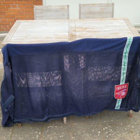 Dækkenet har aftagelig hals og fluemaske, to bringespænder, stor maveklap og tre gjorde, halesnor og benstropper.