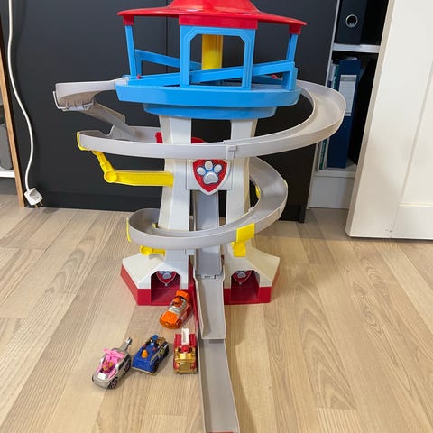 Paw Patrol parkeringshus legebane til biler. Tårnformet bane med flere etager, ramper og nedkørsler til små legetøjsbiler. Øverste niveau fungerer som parkeringsområde, og bilerne kan køre hele vejen ned ad den snoede bane til udgangen. Egnet til leg med Paw Patrol-biler og andre små køretøjer i tilsvarende størrelse.