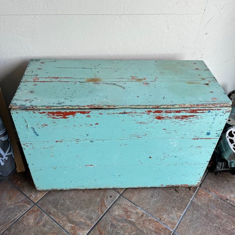 Træskiste i blåmalet træ. Kisten har hængslet låg og bærehåndtag i siderne. Indvendigt er der et mindre rum i den ene ende til opbevaring af mindre genstande. Velegnet som opbevaringskiste eller som møbel i bolig, sommerhus eller værksted. Ca 120 cm bred - 60 dyb og 65 cm høj
