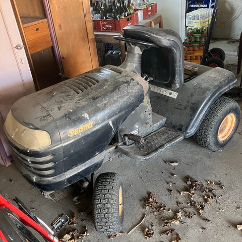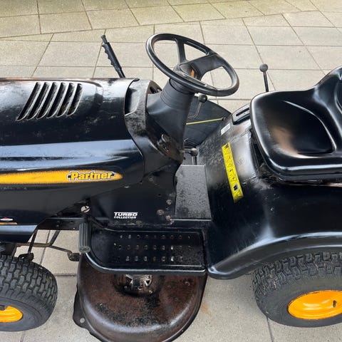 Partner P12107 havetraktor, fra 2005. Har stået stille ca. 2 år. Motor starter nemt. Går lidt ujævnt, pga. det manglende luftfilter.