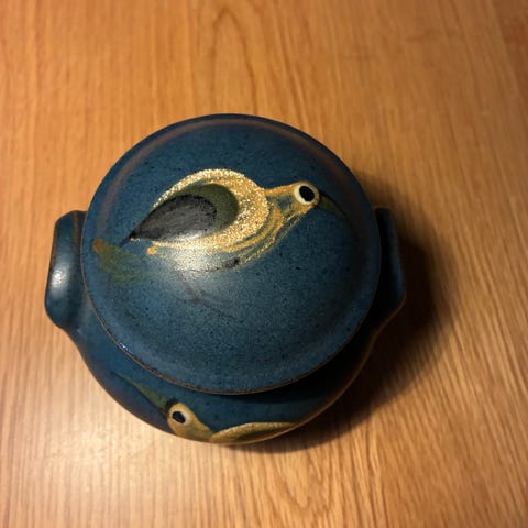 Dybdahl Denmark keramik skål med to hanke. Gryden er udført i glaseret stentøj med brun inderside og blågrøn yderside dekoreret med mønster. Signeret "Dybdahl Denmark" og dateret 1982 i bunden. Velegnet som serveringsskål, suppegryde eller dekorativ opbevaringskrukke i køkkenet.