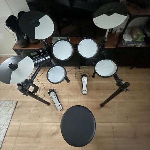 Trommesæt er i god stand og fungerer som det skal, på nær lille mislyd på en tromme.
