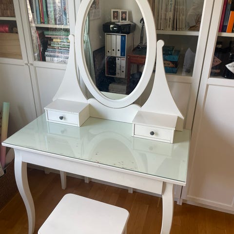 Fint sminkebord med glas plade. Kræver nok at men kan udskifte stoffet. Vores datter er vokset fra det.