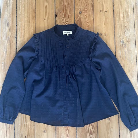 Fineste Lollys skjorte i hvid med fine metalik striber i str. L. Brugt en gang. Fra røg og dyrefrit hjem.