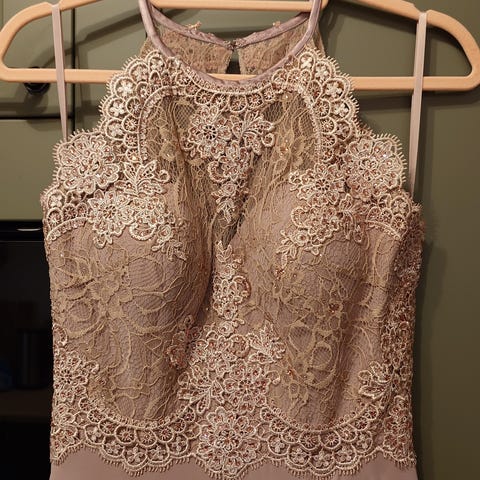 Fabyluxe couture USA Couture kjole til særlige lejligheder i lyserød polyester til kvinder i størrelse S. Kjolen er lang og figursyet med dekorative detaljer og glitrende overflade på stoffet. Overdelen har udsmykning omkring halsudskæringen og brystpartiet. Foret indvendigt for øget komfort. Velegnet til brug ved festlige lejligheder som gallafester, bryllupper eller andre særlige begivenheder.