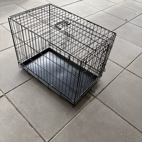 Hundebur i metal i sort farve med aftagelig bundbakke i plast/metal-look. Brugt inde ganske få gange. Buret har tråd-konstruktion med låger i siden og forenden, som kan lukkes med skydebeslag. Egnet til transport eller som hvileplads for hund i hjemmet eller i bilen. Størrelsen passer typisk til mindre til mellemstore hunde, afhængigt af race og behov. Kan klappes sammen for lettere opbevaring, hvis konstruktionen tillader det. Måler 77 cm lang 49 cm bred 55 cm høj købt i Biltema for 369.- kun afhentning. Pris 150 kr