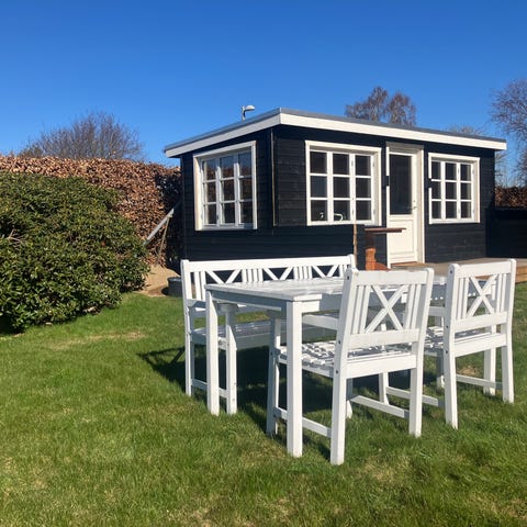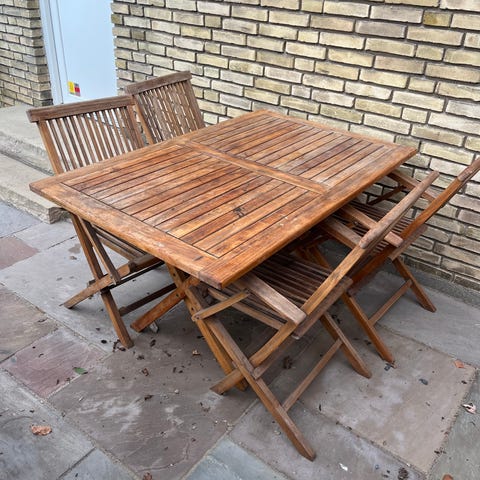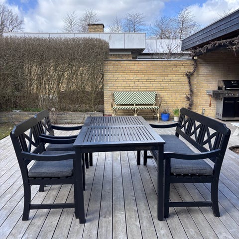 Havebordssæt i træ med to stole, bænk og skærmvæg