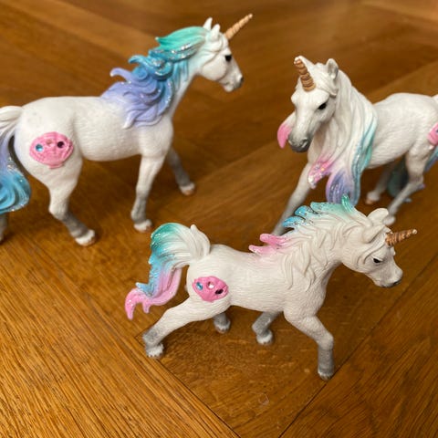 Dyrene er en enhjørninge-unge, en dragemor med unge og en delfin med tre unger.