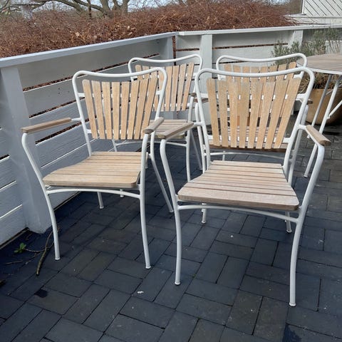 Brugt i 4 sæsoner og fremstår i god stand. Bordet har naturlig patina i teaktræet (kan nemt friskes op med olie, hvis man ønsker den gyldne farve igen). Har været opbevaret i opvarmet garage uden for sæson – se billede.