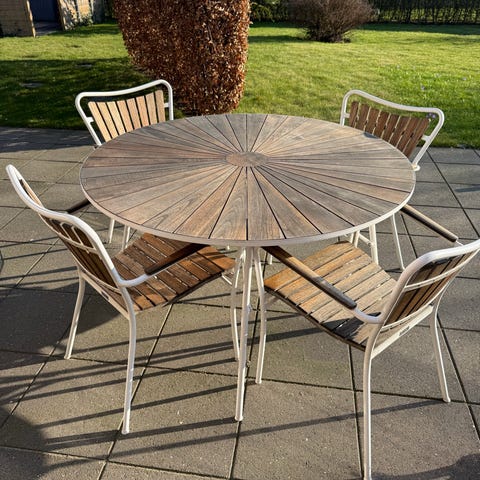 Flot og stilrent havemøbelsæt fra Mandalay Marguerit-serien sælges. Sættet består af et rundt havebord (Ø140 cm) samt 6 matchende havestole i hvid pulverlakeret aluminium med teakdetaljer.