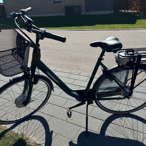 Batavus Verona e-go elektrisk damecykel fra 2017 i størrelse 53 cm, senest har fået årsservice i oktober 2025. Foran er der monteret en cykelkurv - nøglen til cykelkurv er desværre blevet væk, så den kan ikke tages af. Modellen har håndbremser og gearskifter (7 gear) på styret.