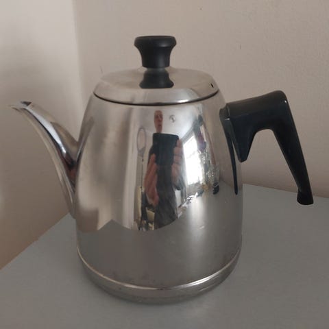 Flot kedel i rustfrit stål, med lille varmeskade på håndtaget.