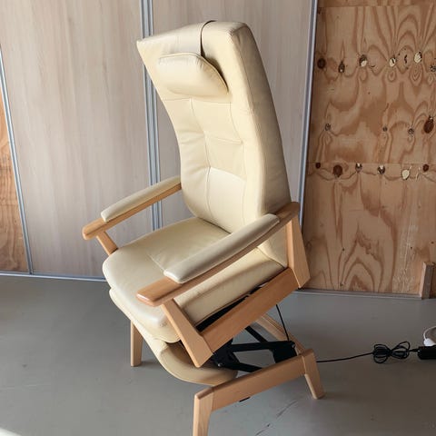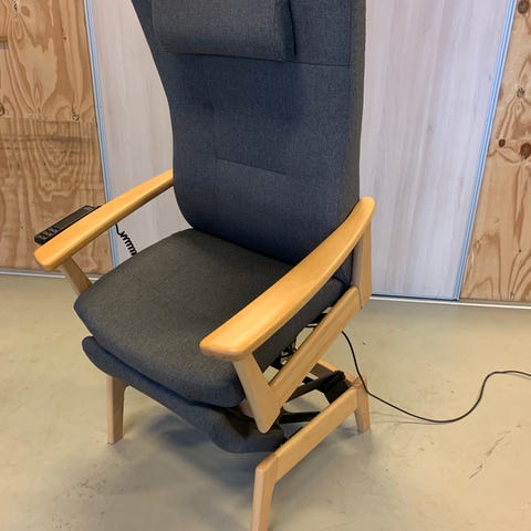 Farstrup elektrisk Otium stol. Denne model har både elektrisk sænkning af ryg, hævning af skammel/benstøtte samt hævning af sæde for stå-op-hjælp.