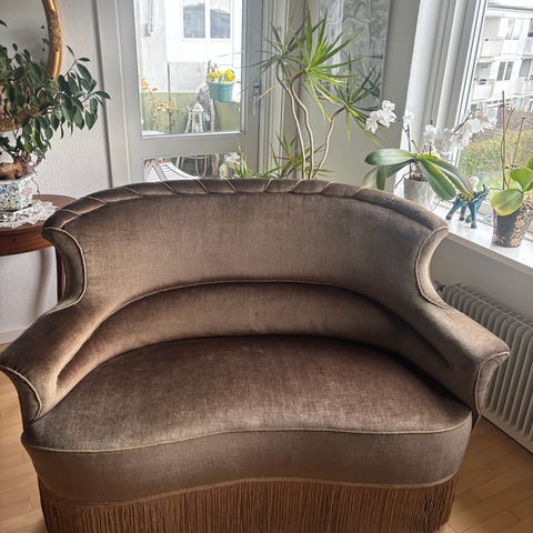 Halvrund sofa vurderer det til at være ca. 80 år gammel sælges. Sofaen er i god stand efter alderen og er blevet ombetrukket et par gange igennem de mange år. Har altid stået i mit barndomshjem men jeg har desværre ikke plads til den mere.