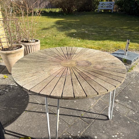 Originalt marguerit havebord fra 60'erne i god, original stand. 100 cm i diameter, 64 cm højt. Har lidt rester af tynd lak, så kun behov for en let slibning og olie, og så vil det stå flot. Nemt at skille ad, fylder kun lidt ved vinteropbevaring. Sælger også 4 originale marguerit havestole, se min anden annonce.