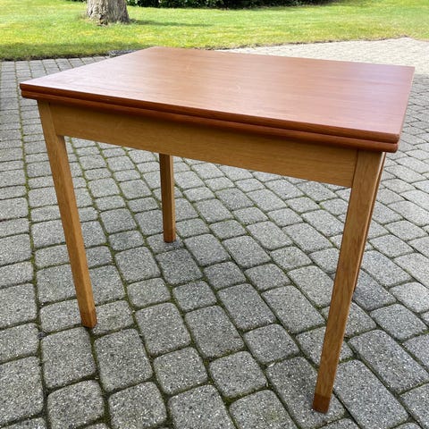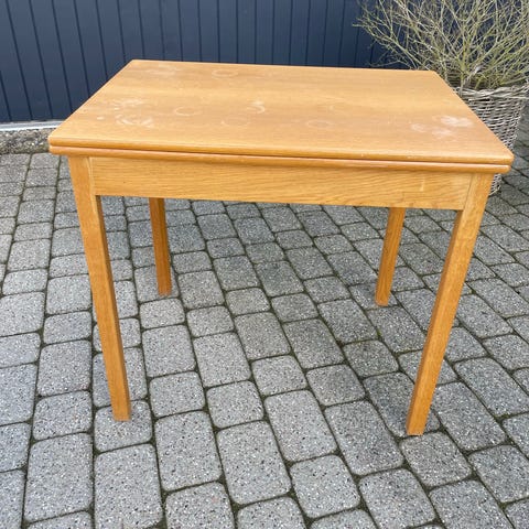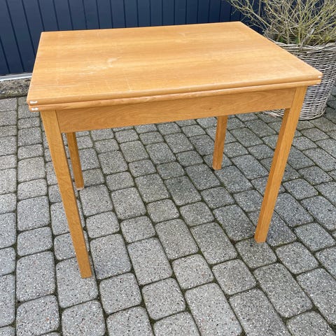 Kopi af Ejner Larsen / Børge Mogensen spillebord fra 50-60’erne i egetræ. Perfekt til det lille køkken og kan nemt gøres dobbelt i størrelse. Måler 60x80 eller 120x80. Har brugspor, som forventeligt.