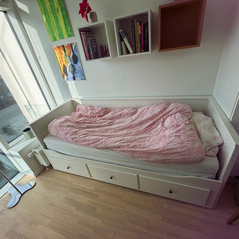 Sengen fremstår pæn og velholdt med almindelige brugsspor. De tre store skuffer giver rigtig god opbevaringsplads til sengetøj, legetøj eller tøj. Madrasser medfølger.