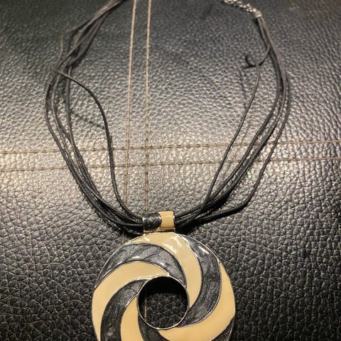 Halskæde med små blå perler fordelt mellem aflange metalled. Velegnet som smykke til hverdag eller fest. Materiale og længde er ikke oplyst.