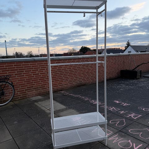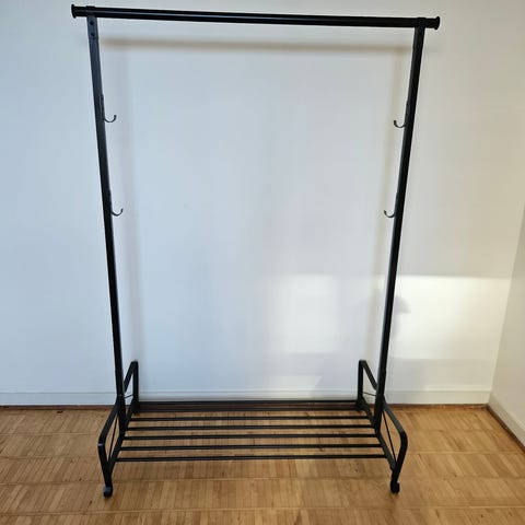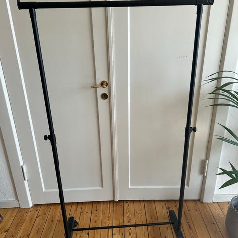 Tøjstativ, jern og 2 kroge på hver side og sko- taskehylde.