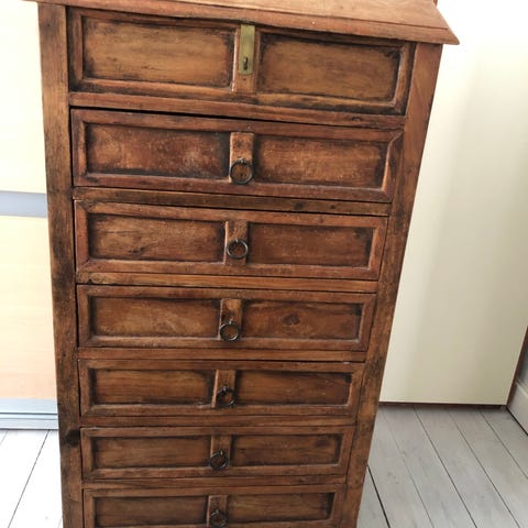 Skrivekommode i træ med klap og flere skuffer. Øverst en stor klap, der kan slås ned og bruges som skriveplade. Indvendigt er der små skuffer og rum til opbevaring af papirer og småting. Nederst er der tre store, udvendige skuffer med greb i metal. Møblet står på korte ben og har et klassisk, tidløst udtryk, egnet til brug som skriveplads og opbevaringsmøbel i stue, kontor eller soveværelse.