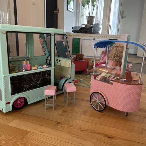 Legetøjs isbil med tilbehør i mintgrøn og rosa. Sættet består af en isbil med åbning i siden, serveringsdisk, håndvask, opbevaringsrum og siddeplads. Medfølgende tilbehør omfatter blandt andet isvafler, ispinde, donuts, kager, drikkevarer, tallerkener, kopper, bestik, penge og små flasker. Der følger også taburetter til kunder foran disken. Egnet som rollelegssæt for børn, hvor der kan leges isbod eller foodtruck.