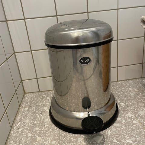 Vipp pedalspand i sort metal med rundt design. Spanden har pedalåbning i bunden og låg i rustfrit stål. Udstyret med håndtag i siderne for nem flytning. Egnet til brug i køkken, bryggers eller badeværelse.