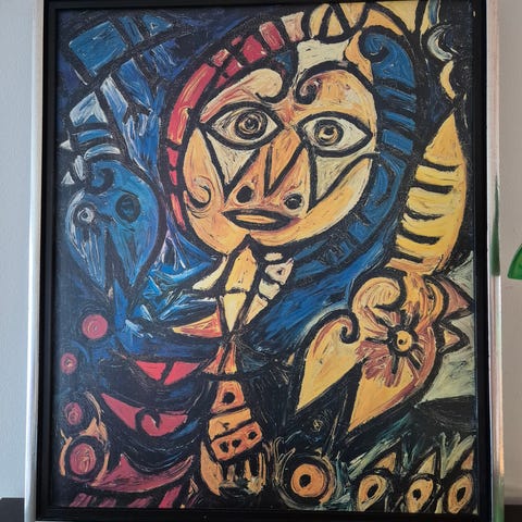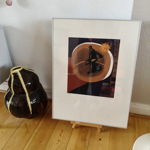 Motivet viser børnene nøgne foran en varmekilde i et interiør. Billedet er indrammet i en dekoreret guldfarvet ramme. Bagsiden har mønstret papir og ophængssnor. Velegnet som vægdekoration i fx stue, gang eller børneværelse, afhængigt af indretning og smag.