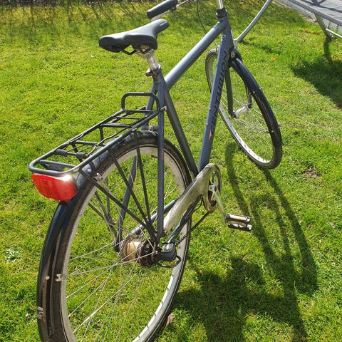 Ældre brugt herrecykel som trænger til en grundig istandsættelse. Alternativt kan saddel, lås mm. genbruges.