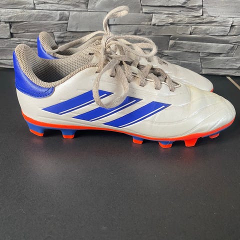 Adidas Copa fodboldstøvler i sort med hvide striber og pink sål. Modellen har faste knopper velegnet til spil på græs. Overdelen er udformet i syntetisk materiale med snørelukning for justerbar pasform. Indersiden er polstret for øget komfort under brug.