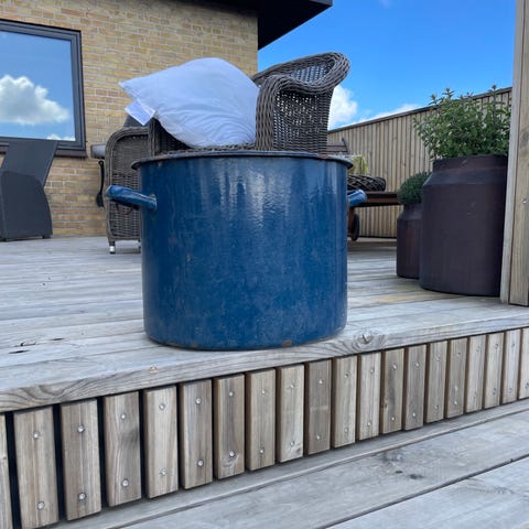Stor brun emalje “gryder” med to sidehåndtag. Brugt til blomsterkrukker, derfor er der et lille hul boret i bunden. Højde 38 cm, Ø 44 cm