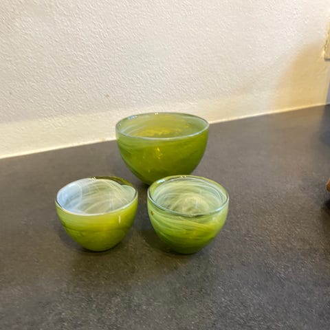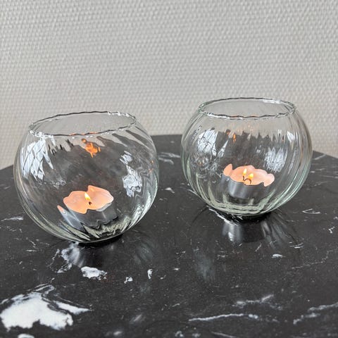 2 stk,. fyrfadsstager fra glaspuster Lene Højlund med grønne/ sorte og hvide striber . De måler 10 cm. og 8 cm. i højde og fremstår i hel og flot stand. Pris er for begge.