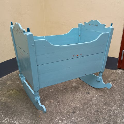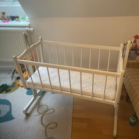 Vugge i træ fra childhome. Der medfølger både madras og Sengerand. Alt i god stand men brugt.