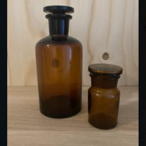 2 Gamle apoteker flasker. Fejler ikke noget, men har dog plastiklåg i stedet for originale låg.