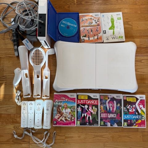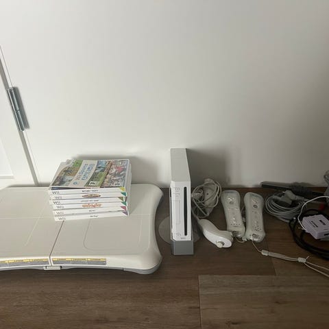 Nintendo Wii konsol med tilhørende Wii Fit Plus balance board. Sættet omfatter konsol, sensorbar, strømforsyning, AV-kabler og Wii-fjernbetjeninger med tilhørende nunchuk-controllere. Der medfølger flere Wii-spil, herunder blandt andet Wii Fit Plus og andre sports-, danse- og familiespil, som ses på billederne. Velegnet til underholdning og motionsspil i hjemmet for flere spillere ad gangen.
