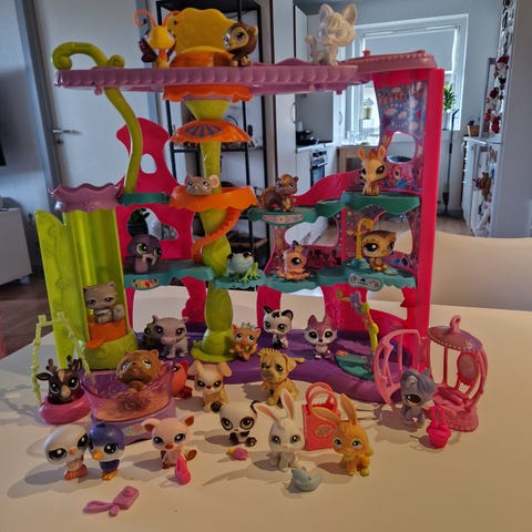 Littlest Pet Shop stort udvalg. medfølger flere figurer, en dukke med flere sæt tøj, flere bygninger, herunder flere huse og en bil. Huset kan åbnes. Fremstår rigtigt flot.