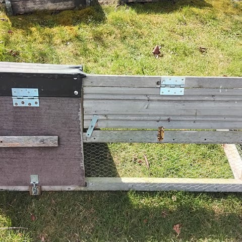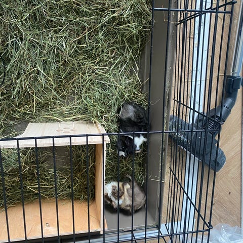 Bur til marsvin eller andre små gnavere i hvidmalet træ. Buret har to niveauer og god bundplads til hø, skjul og tilbehør. Fronten har gennemsigtige felter, så dyrene kan ses, og der er låger med hængsler for adgang til rengøring og fodring. Toppen har åbninger med net, som giver lys og luft. Velegnet til placering op ad væg eller som rumdeler.