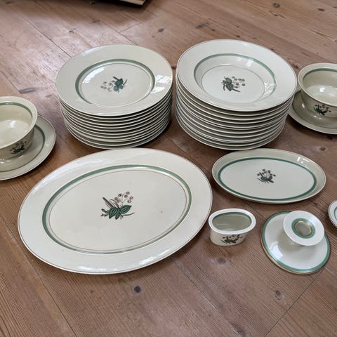 6 tallerkner og 1 skål. 1 tallerken med et skår.