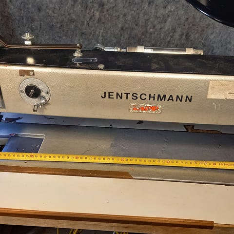 Dürkopp industrisymaskine med fast monteret arbejdsbord og integreret skuffe. En-tråds Dürkopp stikkestings-symaskine. Pedalstyret trådafskæring.